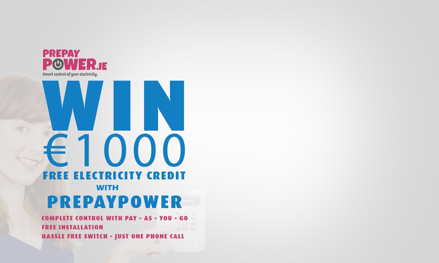 Don’t miss your chance to win €1,000 in FREE electricity with PrePayPower! Join over 100,000 satisfied customers who have switched to smart control of their electricity. It’s easy to take control of your energy usage and savings.